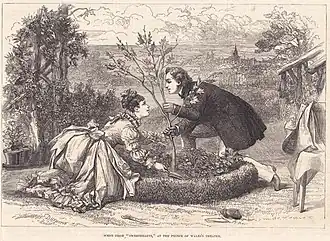 This romantic comedy of manners was written for Squire Bancroft and his wife Marie (née Wilton), managers of the Prince of Wales's Theatre, and starred Mrs. Bancroft. Gilbert wanted his friend John Hare to play the male lead, to take advantage of Hare's naturally boyish appearance and of his talent for impersonating elderly men, contrasting the character in youth in the first act and old age in the second. In rehearsal, however, Hare struggled with playing the young romantic lead, and the Bancrofts were not satisfied with him, and so another company member, Charles Coghlan, played the role.[2] The Bancrofts had produced the best plays of Tom Robertson in the 1860s, and Sweethearts was Gilbert's tribute to Robertson's "realist" style. The importance of small incidents is emphasised, characters are revealed through "small talk," and what is left unsaid in the script are as important to the play as what is said in the dialogue. These are all Robertson trademarks, though they are not key features of Gilbert's other plays. However, the play combines sentiment with a typically Gilbertian sense of irony. The story of the play deals with themes such as the differences between men's and women's recollections of romantic episodes, and the spread of housing developments to greenfield land.