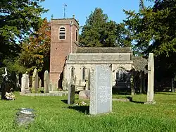 The parish church of St Peter is recorded in the National Heritage List for England as a designated Grade II* listed building.[8] It is an active Anglican parish church in the diocese of Chester. A Saxon cross, discovered during 19th-century excavations, is displayed in an alcove but the oldest surviving part of the church is the cruck-framed sanctuary, dating from approximately 1260. The nave was added in around 1500, and the church was encased in brick in 1722, at which time the brick tower was added.[9]