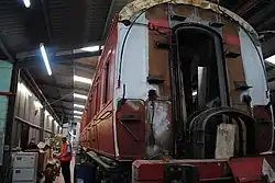 - Wickham trolley No 9031 (Type 27 Mk III, Works No. 8089), a small four-wheeled vehicle for departmental use.[5] Crew cab seating eight. Smaller than normal railway vehicles to standard loading gauge, as it is roughly 6 feet (1.8 m) tall. Has no external couplings/drawbar or buffers. Operational and fitted with Kohler diesel engine.[6]