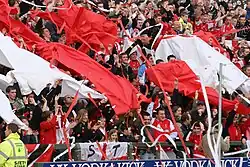 The supporters' trust, TrustSTFC, was established in 2000. This organisation is a democratically elected group of fans who raise funds for the club and aim to give supporters access and input into decisions made by the club's board.[102] The group run a number of schemes including the Loan Note Scheme, the aim of which is to buy shares in the club and assist with investment.[103] Another scheme is the Red Army Fund; the money raised by this fund is given to the club to contribute towards the purchase and wages of new players.[104] TrustSTFC also take part in the Fans' Consortium, which aims to place a supporter with a large stake-holding in the club onto the board of directors.[105] The trust is also currently campaigning with the club for the re-development of the County Ground.