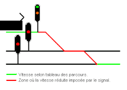 The speed reductions imposed by type L signals, when they are protecting a station or a crossover, only apply to the points zone protected by the signal and not normally to the stretch of track beyond the points. Thus if a signal presents the aspect 2 (maximum speed 40 km/h at the signal), the 40 km/h limit applies from the signal and over the points concerned. ; as soon as the train has passed the last points in deviated position it can accelerate to the operating speed. This way of operating requires that the drivers understand for any signal which points are concerned.