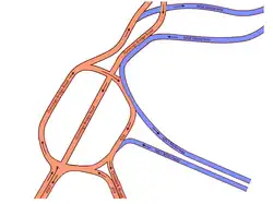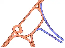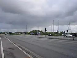The junction underwent a minor redesign in 2006 when new section of carriageway was built at the M57 terminus, allowing motorists to directly transfer onto either the A5036 or A59 roads.[13] The primary objective was to ensure the junction could withstand the predicted increase in road traffic for the next decade and help improve the flow of an estimated 43,000 vehicles daily.[13] At this time, the island was handling up to 80,000 vehicles every day, of which 10% were heavy goods vehicles and resulting in extensive traffic queues leading to increased risks of traffic accidents.[14] The roadworks completed in Spring 2006, resulting in a revised junction layout and removing the roundabout configuration. A short stretch of the original roundabout remained in existence to be utilised as an inspection area and weighbridge, operated by the Vehicle Inspectorate; this was reconstructed following construction of the new Thornton to Switch island link road which has carriageway in some parts of the old roundabout.
