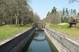 Swoboda Lock is the seventh lock on the Augustów Canal (from the Biebrza). It is situated amidst the Augustów Forest near Lake Studzieniczne. It was built between 1826 and 1827 by Lt.-Col. Eng. Jan Paweł Lelewel. In the 1960s it underwent modernization involving the replacement of original wooden gates with metal crank-driven mechanism raised, reinforced concrete bridge was built a distinctive and concreting awanportu. New system to move the gates did not work and was later by one of the membranes removed, and replaced the original system of drawbars.