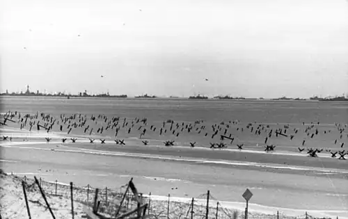 Under the command of Field Marshals Erwin Rommel and Gerd von Rundstedt, the defences of the Atlantic Wall were heavily upgraded; in the first six months of 1944, 1.2 million tons of steel and 17.3 million cubic yards of concrete were laid.[39] The coast of northern France was also studded with four million antitank and anti-personnel mines, and 500,000 beach obstacles.[39]
