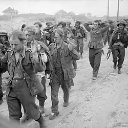 Since the spring of 1942, Generalleutnant Wilhelm Richter's 8,000-man strong 716th Infantry Division had been positioned to defend the Calvados coast of Normandy.[44] In March 1942, the 352nd Infantry Division assumed control of the western Calvados coast, leaving the 716th in position north of Caen covering an 8-mile (13 km) stretch of coastline. The division comprised four regular infantry battalions, two Ost battalions, and artillery units.[45] Four infantry companies were spread along Sword, with two positioned facing Queen sector—another four were positioned inland behind the beach.[4] Further inland, Generalleutnant's Edgar Feuchtinger's 16,297 strong 21st Panzer Division had been positioned on both sides of the River Orne around Caen to provide an immediate counter-attack force should a landing take place.[46][47][48] In May 1944, two Panzergrenadier battalions and an antitank battalion from the 21st Panzer Division were placed under Richter's command;[45] this deployment eliminated 21st Panzer as a mobile reserve.[48] One of these battalions, along with the division's anti-tank guns and several mobile 155 mm guns, was positioned on Périers Ridge, which rose to about 50 metres (160 ft) above sea level, 3 miles (4.8 km) south of Sword.[31][49][50]