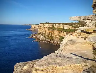 Sydney sandstone was deposited in the Triassic Period probably in a freshwater delta and is the caprock which controls the erosion and scarp retreat of the Illawarra escarpment.[5][6][7] Sandstone escarpments box in the Sydney area on three sides: to the west the Blue Mountains, and to the north and south, the Hornsby Plateau and Woronora Plateau. These escarpments kept Sydney in its bounds and some people still regard the spatial boundaries of the city in these terms.[8]