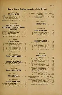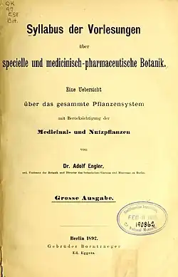 Engler's starting point was that of Eichler who had been the first to use phylogenetic principles, and reflected the new post-Darwinian perspective, although Engler himself did not think that his was.[2] His modified Eichler schema first appeared in 1886 in his Guide to Breslau Botanic Garden[3] (of which he was the director) and was expanded in his Syllabus in 1892.[4] This reflected the new post-Darwinian perspective. Engler's Syllabus der Pflanzenfamilien first appeared in 1892 with the title Syllabus der Vorlesungen über specielle und medicinisch-pharmaceutische Botanik. Many subsequent editions have appeared since, and it was continued after Engler's death in 1930. The most recent edition was the 13th in 2009.[5] A number of references to the Engler system actually refer to later revisions ('modified Engler system') undertaken by Melchior and colleagues, the 12th edition of the Syllabus, also referred to as the Melchior system.