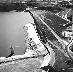 The upper dam was constructed in 1921 with the hydraulic fill process, three years after the larger lower dam, which was fabricated using the same style. An inspection of the lower dam in 1964 paved the way towards an arrangement between the State of California and the Los Angeles Department of Water and Power that would maintain the reservoir's water level that was reduced 10 feet lower than was typical. Since the collapse of the dam lowered its overall height, the decision to reduce its capacity proved to be a valuable bit of insurance.[24]