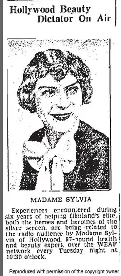 Broadcast between 1933 and 1936, Sylvia's radio show, Mme. Sylvia, was a 15-minute beauty and celebrity broadcast sponsored by Ry-Krisp. Syndicated across America, her show was aired at 7:30pm on station KGO and KFI.[54] On 3 October 1932, Sylvia's guest was Glenda Farrell,[55] and on 17 October the guest was Grace Moore.[56]