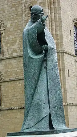 The insignia and shield of a male figure holding a sword across his mouth has represented the diocese of Chichester since the 13th century.[16] The imagery is parallel to that seen in an early 14th-century manuscript of the Apocalypse of St John.[16] This illustrates several passages with a figure who variously has a sword across his mouth, holds an open book, and is seated on a throne.[16] |