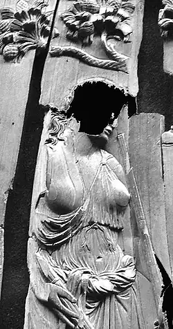 The diptych was produced in Rome sometime between 388 and 401.[1] The Nicomachi panel measures 29.9 × 12.6 centimetres (11.8 × 5.0 in), that of the Symmachi is 29.8 × 12.2 cm (11.7 × 4.8 in). Both wings depict female figures engaged in religious ritual before sacrificial altars. The Nicomachi tablet in Paris is the less well preserved of the pair, having been damaged in a fire. The ivory is fractured in several places, with some sections missing completely, together with high-relief areas such as the female figure's face, left hand and right arm. This figure stands before a round altar, holding two lit torches now partially missing. Cymbals hang from a pine tree overhead; both the tree and its hangings are attributes of the goddess Cybele and her consort Attis.[4]