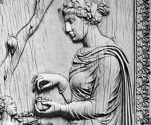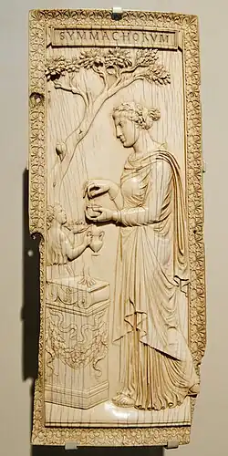 The Symmachi leaf in the London diptych has an ivy-crowned woman sprinkling incense over the flames of a square altar, garlanded with oak wreaths. She is attended by a small figure holding a kantharos and a bowl of fruit. The oak garlands and overhead oak tree suggest the worship of Jupiter, while the ivy leaves recall the god Dionysus.[5] The female figures have been variously interpreted as priestesses[5] and as goddesses.[6]