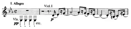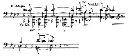 The Adagio was first conceived in classical sonata form, with development, not the ternary structure with elaborate middle section. The exposition and the recapitulation are similar to that of the Linz version. In the beginning of its central section a third Schumanesque motif is introduced, which will be partially re-used as accompaniment of the oboe solo of the middle section of the Linz version.[1] This early version of the Adagio (manuscript Mus.Hs.40400) was partially orchestrated, without trumpets or trombones. The recapitulation of the first motif is played by the strings and decorated by the winds. The recapitulation of the second subject, which was sketched only by the second violins and the woodwinds, breaks off at bar 154. Thereafter, five bars were left unwritten before the – on the contrary – fully orchestrated close of the movement.