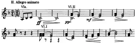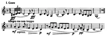 The second theme (Moderato), in the violins, is interesting in its melodic structure, which uses the gypsy scale (with two augmented seconds). It is also harmonically unusual because of its ambiguous tonality. This theme is repeated by the whole orchestra in a sudden and powerful fortissimo, which leads to the first theme climaxing in a brass chorale. At the beginning of the repetition, the cell-grupetto reappears insistently.[16]