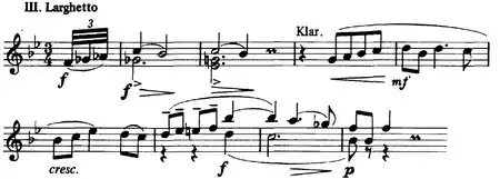 In the lyric calm of this movement, even the grupetto seems to have lost its menacing tension. The clarinet sings an easy and soft melody, but in the middle some storms appear with the gloomy harmonies of the muted horns. The theme, repeated, is ornamented with repetitive appoggiatura and counterpoint.[16]