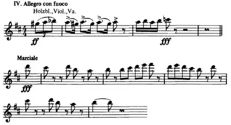 A calm con anima passage follows with a melody in the violins which goes quickly to high notes. Brass instruments take a prominent role followed by a new change in the central part (Allegro mosso), introduced by repeated notes in the low strings. The rhythm is especially interesting, with its soft syncopation (related to a binary rhythm in a ternary bar): repeated accompaniment from the scherzo appears in the second part and the return of the grupetto relaunches the movement with its dynamic and orchestral violence. A tam-tam hit follows the coda, at the end of which the grupetto, played by the strings in a slower time, is repeated with a prophetic insistence, strengthened by the brass and percussion instruments.[16]