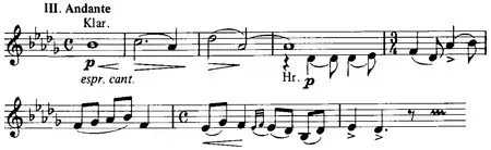 The Andante begins with what Oldani calls "one of Borodin's most serene melodies," [7] played by solo clarinet and accompanied by the harp, and what follows is a horn solo with the ornamental grace notes that are quite typical of Borodin's lyrical melodies.[7] This melody is heard from various instruments throughout the piece, while some of the material incorporates the interaction between minor and major thirds present in the Allegro (I).[7]