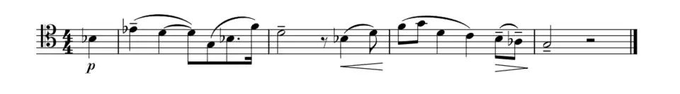 Lyatoshynsky's First Symphony, with its dynamic finale that conformed with emerging Soviet expectations in large-scale orchestral works,[21] is more tuneful than the Second, and more influenced by the style of the Russian composer Alexander Scriabin.[22] The symphony contains dramatic contrasts.[1][23] Lyatoshynsky used the bass clarinet to obtain a distinct orchestral sound, and in combination with the bassoon, a grimly dramatic effect is produced.[24][note 3] The symphony's re-occurring motto-like leitmotif acts to give the work a sense of unity:[5]