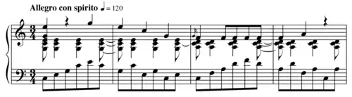 The first movement is notable for its use of horns in G instead of the usual horns in C (compare Haydn's earlier C major symphonies and those of his brother Joseph), so that the horns can participate in the harmonization of ii chords. The music begins straightaway with a triadic theme and bass on the beat, offset by half-beat syncopation in the second violins and violas.