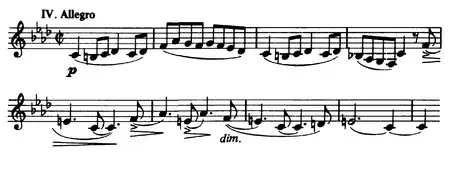 The fourth movement is in F minor (ending in F major) and features a modified sonata form in 2