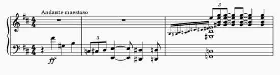 The work is fundamentally monothematic, and based on the material of the first theme of the first movement.[9] This theme reappears in the second movement as an "ostinato background", at the beginning of the third movement, and during the finale.[11] Lyatoshynsky used polyphonic techniques for presenting and unfolding the material: themes are superimposed on each other, transformed, and complicated by imitations, canons, and fugato. He also used polyphony in the exposition sections.[9][12]