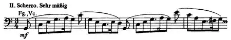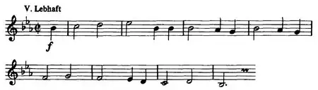 Just as the second movement of Beethoven's Sixth Symphony depicts a flowing brook, the second movement of Schumann's Third Symphony is a musical depiction of the flowing river Rhine. In both pieces, this imagery is due to the flowing eighth notes in a wave contour. One of the clearest differences between Beethoven's and Schumann's approaches to using programmatic elements in their symphonies is that Beethoven actually left a title to his second movement: "Szene am Bach" (Scene at the brook). Schumann also originally left a title which translated to "Morning on the Rhine", but that was removed before publication.[6]