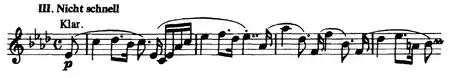 The third movement, "Nicht schnell" (not fast), is in the subdominant A♭ major. The omission of timpani and brass in combination with the static harmony (the movement never strays far or for long from A♭), creates a moment of calm repose in the middle of the symphony. The thematic construction uses long beautiful themes that are constantly being pushed along by this friendly little motif of four chromatically ascending sixteenth notes, often on the fourth beat of a measure. In a typical performance this movement lasts approximately 5 minutes.
