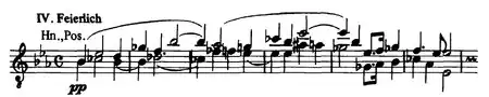 The fourth movement (the "Cathedral" movement), "Feierlich" (solemn) is meant to suggest a "solemn ceremony" at which an archbishop was made cardinal in the Cologne Cathedral. It's written with 3 flats as the key signature, but most of the movement is actually in E-flat minor (6 flats). The movement begins with a sforzando eighth-note E♭ minor chord in the strings that moves immediately into a pianissimo French horn and trombone chorale. This beautiful and hauntingly quiet low brass writing is a notoriously difficult spot in performances since the trombones have yet to play at all up until this point. This expansive theme is voiced by the winds and first violins in eighth notes, accelerating the tempo by more than double the previous tempo, as the opening statement reaches its conclusion. Following the opening statement's conclusion, the theme is used in imitation, mostly at intervals of a fourth and fifth, and combined with an accelerated version. After this, the tempo changes into a triple meter where the first theme undergoes a series of contrapuntal treatments. While the meter returns to a duple meter, the brass and winds play interwoven contrapuntal lines of the most expansive form of the theme while the strings push forward with constant 16th notes. This comes to a close on an E♭ minor chord, and after one beat's rest an unexpected fanfare in B major which is then answered by the strings in pianissimo, restating it in E♭ minor. While this is repeated the rhythmic motion slows down, and fragments of the theme can be heard at the end. In a typical performance this movement lasts approximately 6 minutes.