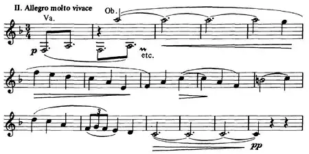 Many commentators have heard in the symphony evidence of struggle or despair. Harold Truscott writes, "This work ... is full of a foreboding which is probably the unconscious result of ... the sensing of an atmosphere which was to explode in 1914 into a world war."[5] Sibelius had also recently endured terrors in his personal life: in 1908, in Berlin, he had a cancerous tumour removed from his throat. Timothy Day writes that "the operation was successful, but he lived for many years in constant fear of the tumour recurring, and from 1908 to 1913 the shadow of death lay over his life."[6] Other critics have heard bleakness in the work: one early Finnish critic, Elmer Diktonius, dubbed the work the Barkbröd symphony,[7] referring to the famine in the previous century during which starving Scandinavians had had to eat bark bread to survive.