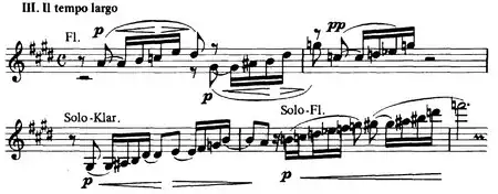 The interval of the tritone dominates the melodic and harmonic material of the piece, but in a completely different way from how it dominates the Third Symphony. It is stated immediately, in a dark phrase for cellos, double basses and bassoons, rising C–D–F♯–E over a hard unison C.
