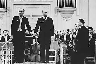 ![]() Yevgeny Mravinsky and Prokofiev taking a bow after the second performance on October 12, 1947 | |