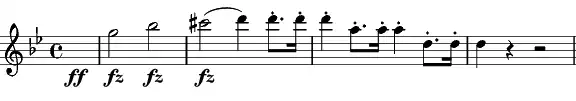 The symphony opens in stormy G minor with the minor triad further intensified by the added dissonance of the C♯. The dotted rhythms that answer are transformed into fanfares later in the first theme group of the sonata form movement.[3]