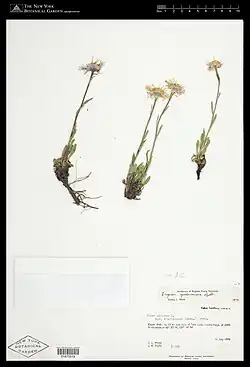 Symphyotrichum yukonense (formerly Aster yukonensis) is a species of flowering plant in the family Asteraceae endemic to disjunct areas in Alaska and the Canadian territories of Yukon and Northwest Territories. It has the common name of Yukon aster, and it is a perennial, herbaceous plant 5 to 30 centimeters (2 to 12 inches) in height. Its flowers have purple to blue ray florets and yellow to brown disk florets. S. yukonense grows at elevations of 300โ1,500 meters (1,000โ4,900 feet) in mud flats and on sandy or silty lake shores.[4] It is a NatureServe Vulnerable (G3) species and is classified Imperiled (S2) in its Canadian range.[1]