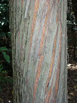 The Aboriginal word for this species is "peebang". Rollo Petrie, grandson of Tom Petrie, who grew up on K'gari and learned the language of the forest, calls it the peebang tree in his memoir, Early Days on Fraser Island, 1913 to 1922.[4] He states, "I have a peebang tree. It is my childhood belong me tree. It is over a thousand years old. I want my ashes scattered at its base. It is now 17.5 feet in circumference. So far it has escaped the axe. If it is cut down I shall die, but I will sing the "Kgari Spirit Song" so all Kgari desecrators will perish" (Roll Petrie, August 1990, taken from his "Nomination of the Great Sandy Region for World Heritage" listing (an unpublished paper).