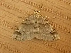 Adults of this species have a wingspan of approximately 3 cm. They are brown with dark markings on the wings.[3]