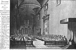 In spite of the hostile attitude of the great majority of the Tuscan bishops, on July 31, 1786 Bishop de Ricci issued a summons to a diocesan synod, which was solemnly opened on the September 18. In convoking the synod, he invoked the authority of Pius VI, who had previously recommended a synod as the normal means of diocesan renewal.[4] It was attended by 233 beneficed secular priests and 13 regulars and decided with practical unanimity on a series of decrees which, had it been possible to carry them into effect, would have involved drastic changes in the Tuscan Church on the lines advocated by Febronius.[1]