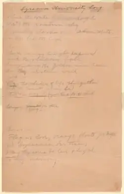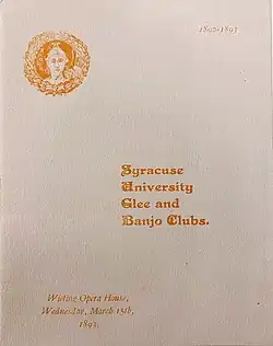 Junius Woods Stevens' composition "The Vale of Onondaga," created in 1893, gained widespread popularity and became a general favorite. It first premiered in a March 15, 1893, performance by the University Glee and Banjo Club at the Wieting Opera House.[1][4][5] The program for the event lists it under the original title of "Song of Syracuse",[6] but it was also occasionally called "Flag We Love".[4][7] While the original handwritten copy of the song includes three stanzas and a chorus,[8] SU's athletics website only lists the verse and the chorus.[9][a]
