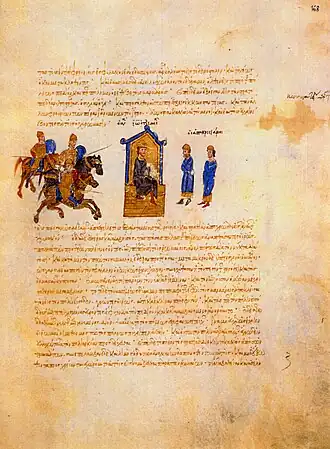 ![]() John Tzimiskes receiving ambassadors from the Rus, miniature from the Madrid Skylitzes. | |||||||||