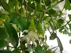 The inflorescences are cymes produced either at the end of the twigs or in the outermost leaf axils, and they carry between one and four flowers. The flowers have short pedicels, four green sepals and four white petals, the latter falling early. They have numerous white stamens up to 33 mm (1.3 in) long and the style is about 40 mm (1.6 in) long.[4][5][6]