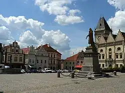 The largest building on the square is the Dean Church of the Transfiguration of Jesus on the Mount Tabor. It was built in 1480–1512 in the style of the Bohemian Renaissance. In the centre of the square there are a Renaissance fountain from 1567–1568, and a statue of Jan Žižka, the greatest of the Hussite leaders. The statue was created in 1884 by Josef Strachovský and replaced a defective statue from 1877 by Josef Václav Myslbek.[16]