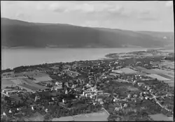 The lake shore was inhabited during the Neolithic and Late Bronze Age. In addition, prehistoric artifacts have been found in the Täuffelenmoos bogs near the modern village. Both Täuffelen and Gerolfingen grew out of celtic villages.[4] During the Middle Ages Täuffelen village was initially probably part of the Barony of Walperswil. In 1247 it was inherited by the Count of Neuchâtel-Nidau. The Counts held it for about a century and a half, until 1398, when Bern acquired the entire Inselgau, including Täuffelen. Under Bernese rule, Täuffelen, Gerolfingen, Hagneck and Epsach were combined into the Epsachviertel (Epsach Quarter) of the Bailiwick of Nidau. Following the 1798 French invasion, Sutz-Lattrigen became part of the Helvetic Republic district of Seeland. With the 1803 Act of Mediation it became part of the district of Nidau.[3]