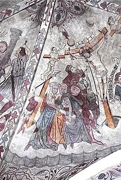 An older fresco of the Pietà can be seen on the east wall behind the altar. Mary is sitting with her dead son on her lap. The depiction of expression of despair is outstanding among Danish frescos. In 2005, a number of other frescos were discovered on the east wall, possibly representing the faces of other figures associated with the crucifixion. The altarpiece has been repositioned on the north wall so that the east-wall frescos can be more easily seen.[4]