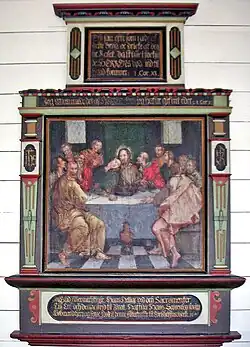 The painting of the central section, the Last Supper, belongs to the large group of Danish 17th-century paintings derived from the painting of the Last Supper by Peter Candid – the Court painter to Wilhelm V – for the Franciscan house in Munich, and popularised through prints by Sandeler. It was restored in 1961 by Ernst and Holmer Trier together with the local painter Fraser Eysturoy. The painting measures 100 x 100 cm.