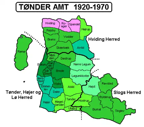 Tønder County (Danish: Tønder Amt) is a former province in Denmark, located the south-western part of Southern Jutland. Tønder County was established in 1920 following the reunification of Denmark with South Jutland following the Schleswig Plebiscites. It was dissolved in 1970 when the bulk of the county merged with three other counties to form South Jutland County. Tønder County corresponded geographically to the northern part of the former Prussian Kreis Tondern except for Hviding Herred, which had been part of Kreis Hadersleben. Kreis Tondern had in turn been established in 1867 in order to simplify the intricate administrative structures of the Duchy of Schleswig, and was formed from regions belonging to Ribe County (exclaves of Denmark) and Løgumkloster County (parts of Schleswig).
