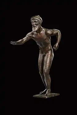 The statuette is made from solid tin bronze and is 16.35 centimetres (6.44 in) tall. It represents a bearded naked man wearing a helmet, in a forward-leaning starting position typical for the Greeks, with the left leg slightly forward and the right arm stretched horizontally forward with an open hand.[1][2] The hole in his left fist clearly indicates that he originally held an object, possibly the grip of a shield.[1] Both feet are on the ground, as if the runner is waiting for the sign to start the race, with his face raised expectantly. His knees are bent and his inclined and well-muscled torso is tensed. The chest is turned towards his left arm, on which he probably wore a round shield.[3] The statuette is missing its separately worked shield.[2] The helmet crest is also mostly missing (a remnant is visible on the 3D model – link below), and originally ran from the front of the helmet down to the middle of the back. The figure is firmly connected to its flat bronze base plate by two round pins on the soles of the feet.[1]