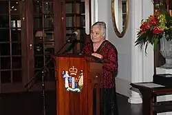 In the 2015 New Year Honours, Turia was appointed a Dame Companion of the New Zealand Order of Merit, for services as a Member of Parliament.[94] Her investiture, by the governor-general, Dame Patsy Reddy, took place at Pūtiki Marae on 13 August 2018.[95] Also in 2018, Turia received the Blake Medal at the annual Sir Peter Blake Leadership Awards.[96] In 2023, Turia was conferred an honorary doctorate in Māori development by Te Whare Wānanga o Awanuiārangi, in recognition of her "continuing dedication and service to her iwi, to Māori and to the community in a career that has been distinguished by unprecedented firsts over the last five decades".[5]