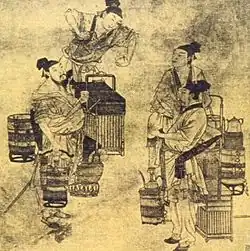 Tōcha (闘茶) is a Japanese pastime based on the identification of different types of tea. The custom originated in China where it is known as Doucha (闘茶) during the Tang dynasty, before spreading to Japan in the Kamakura period. However, whereas Chinese tea-tastings concentrated on assessing the quality of the various teas offered, tōcha became a friendly contest in which players would taste a number of cups of tea and attempt to guess the region from which the tea originated.[1][2][3] Originally the goal was to distinguish the high-quality tea of Kyoto no togano (京都栂尾) from other kinds, but as connoisseurship developed, the goal became the correct identification of the tea's place of origin.[4] The contest eventually attained a standardised formal procedure known as "four kinds and ten cups", in which participants tasted three cups each of three different teas and a single cup of a fourth variety.[3] Prizes, including silks, weapons, gold and jewellery, were awarded for successful guesses,[5] which gave tōcha participants a reputation for excess and extravagance (basara).[3][4]