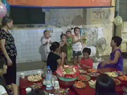 According to Vietnamese customs, during Tết Trung Thu, adults arrange parties for children to celebrate and buy or make various candle-lit lanterns to hang in the house and let the children participate in lantern processions.[2] Tết Trung Thu celebrations often includes moon cakes, candies, sugar cane, grapefruit and other fruits.[6]