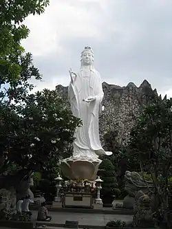 In the front courtyard of the temple is a statue Avalokiteshvara bodhisattva, which stands 9 metres (30 ft), on a lotus seat 3 metres (9.8 ft) high.[1] This is unusually high for an Avalokiteshvara statue in an outdoor courtyard.[6] Before 1975, the khất sĩ Sangha Association had around 300 temples in southern Vietnam, and the temple was the headquarters of the organization.[1]