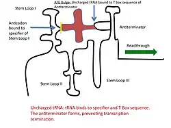 The riboswitch functions by directly sensing a physiological signal.[10] Next, a specific uncharged tRNA binds to a riboswitch element in the transcript, and a structural change occurs in the transcript that promotes expression of the downstream coding sequence.[2][10] The specifier sequence is the first recognition sequence in the leader.[7] It is complementary to the anticodon of the tRNA that is a substrate of the tRNA synthetase under regulation.[7] The second tRNA binding sequence, the T box sequence, is complementary to the nucleotide preceding the acceptor end of the tRNA.[7] The T box is found in the side bulge of the antiterminator.[7]